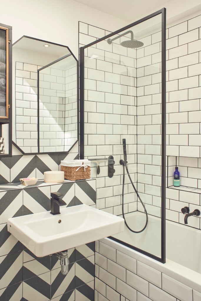 Using small patterns, like geometric shapes or flowers, works well as they’re eye-catching without overwhelming the space. If you’re more of a fan of big patterns, try to limit them to a specific space, like the shower, to avoid the room feeling crowded.